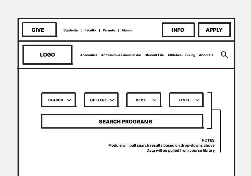One goal was to generate leads and collect data through applications and inquiries. We made this accessible through an ever-present sticky navigation bar with an “Apply Now,” “Request Info,” and “Give” call-to-action buttons as the focal point—tailoring to established personas (prospective students, transfer students, international and alumni). This way no matter where the user is on their journey, they is no confusion on how to take the next step.
