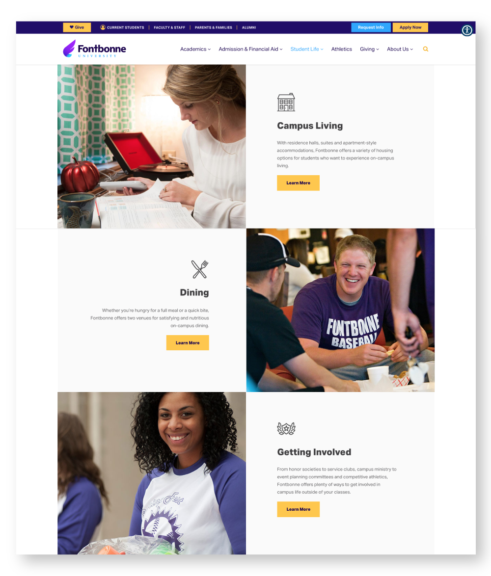 With awareness low and perception misconstrued, Fontbonne University was committed to updating and revitalizing their identity with a new brand and website. It was our task to bring it to life.